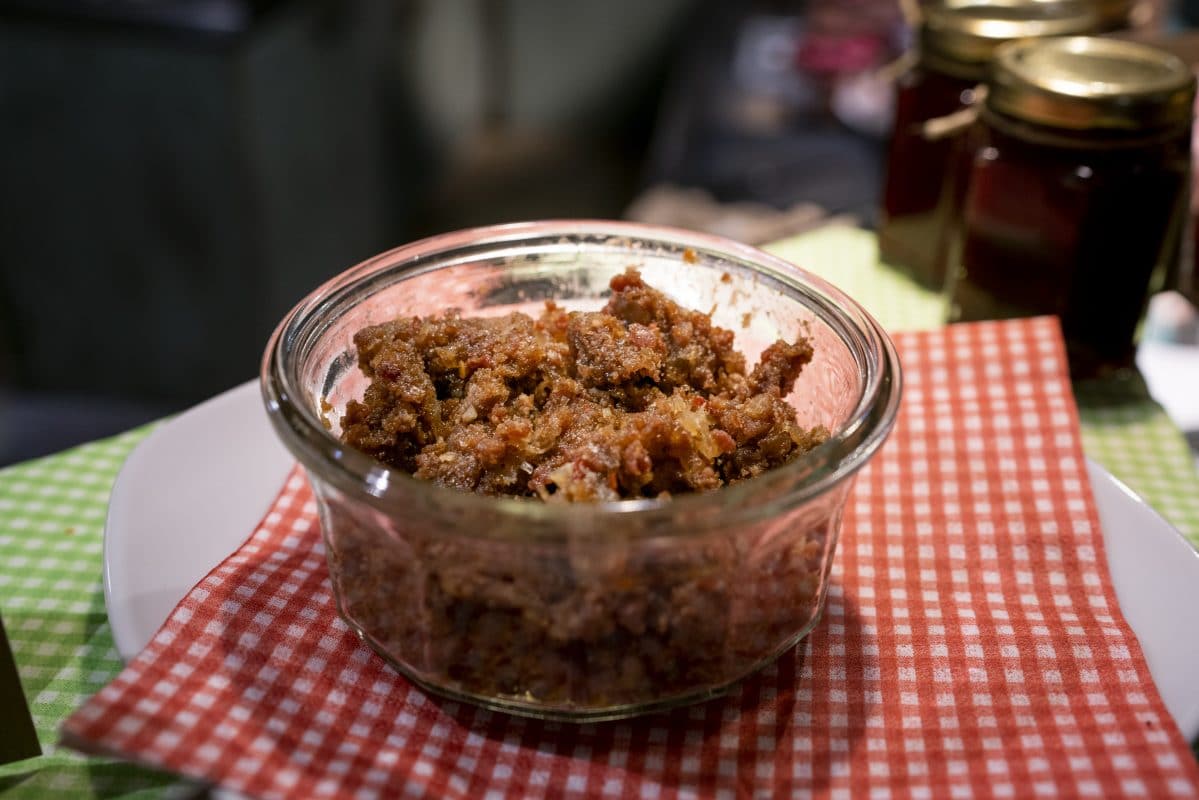 Ach ja, was ist nun das Geheimnis der Speckmarmelade? Nun, die wichtigsten Zutaten sind Speck, angeröstete Zwiebeln sowie ein bisschen Zucker. Mehr aber wird nicht verraten. Wer wissen will, wie sie schmeckt, der kommt am besten selbst