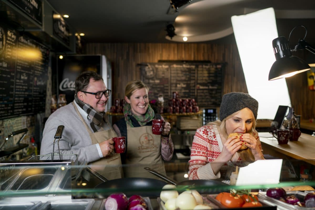 „Rock ’n’ Roll“ auf heimische Zutaten, denn der Bezug zum Salzkammergut ist Ronald Eichenauer sehr wichtig. Besonders stolz ist er auf den originellen Bratwürstel-Burger, eine delikate Weiterentwicklung der Bosna. Die Bratwürstelschnecke der Fleischerei Zauner in Bad Goisern wird mit hausgemachtem Ketchup aus der „Marmeladenkuchl“ und speziellen Gewürzen vom St. Wolfganger „Kräuterhaus“ serviert – einfach köstlich.